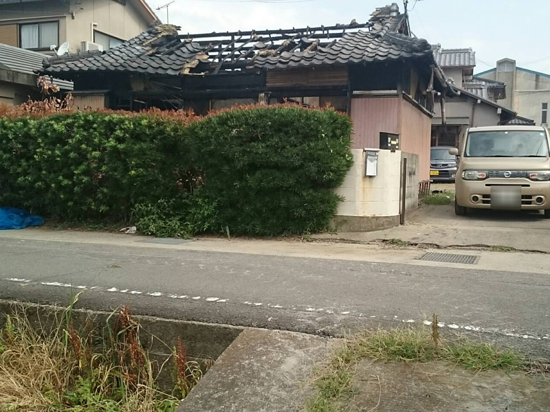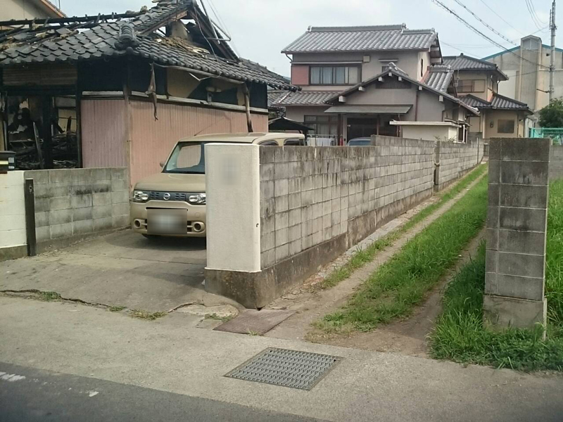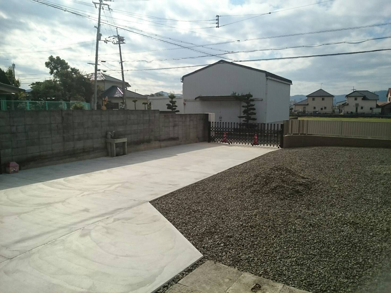 離れ宅撤去、駐車場コンクリート、庭防草シート敷、採石等