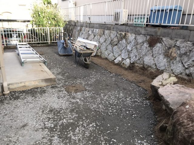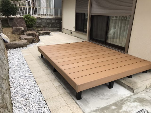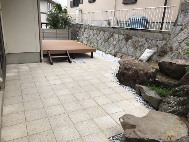 今回は阪南市で、裏庭の工事を行いました。 庭石のやりかえ、インターロッキング、人工木デッキ、フェンスをアルミ製へ